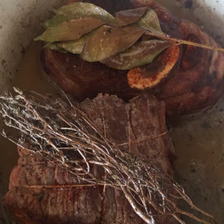 Une fois la cocotte assez chaude déposer les branches d'aromates, les arroser avec le beurre fondu. Saler et poivrer généreusement chaque face de vos pièces de boeufs et faire revenir chaque face, les faire bien saisir, surtout l'os à moelle. "cela aidera à tenir votre moelle pendant les 3 heures de cuissons qui vont suivre"